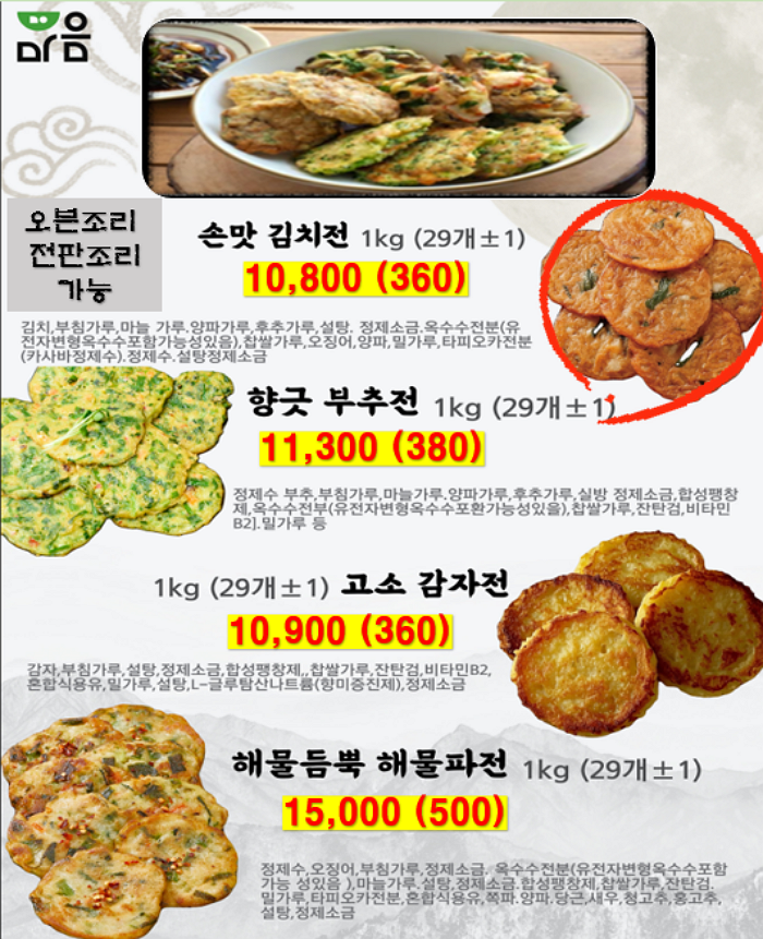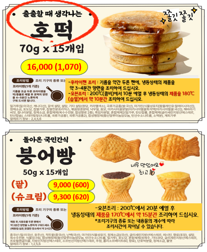 돈까스, 네모떡갈비, 김치전, 연세우유크림떡, 창억떡, 호떡, 붕어빵, 쌀찐빵, 케익, 스모어쿠키,