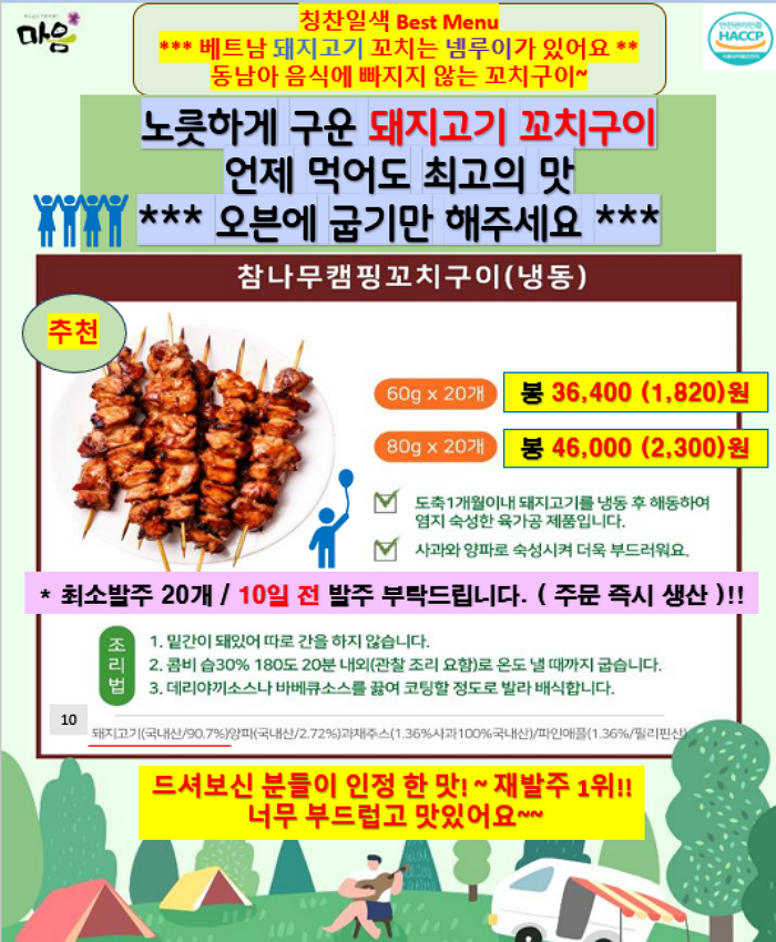 앙버터호두과자, 캠핑꼬치구이, 차슈, 돈마호크, 전복, 오리훈제슬라이스, 수제한우떡갈비, 순대국밥,