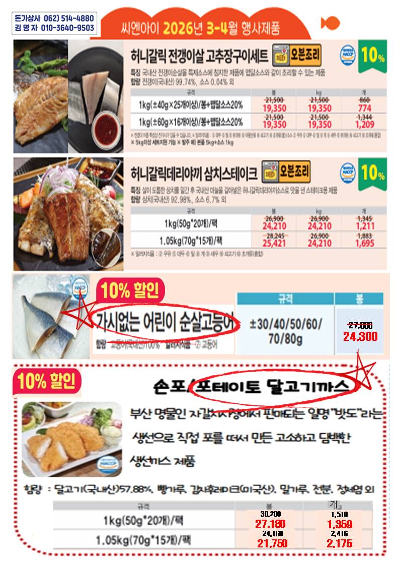 ♡돈가상사♡ 26년3월 신학기 씨엔아이 단가표입니다(/캠핑키조개관자치즈구이/가시없는어린이순살고등어/포테이토달고기까스