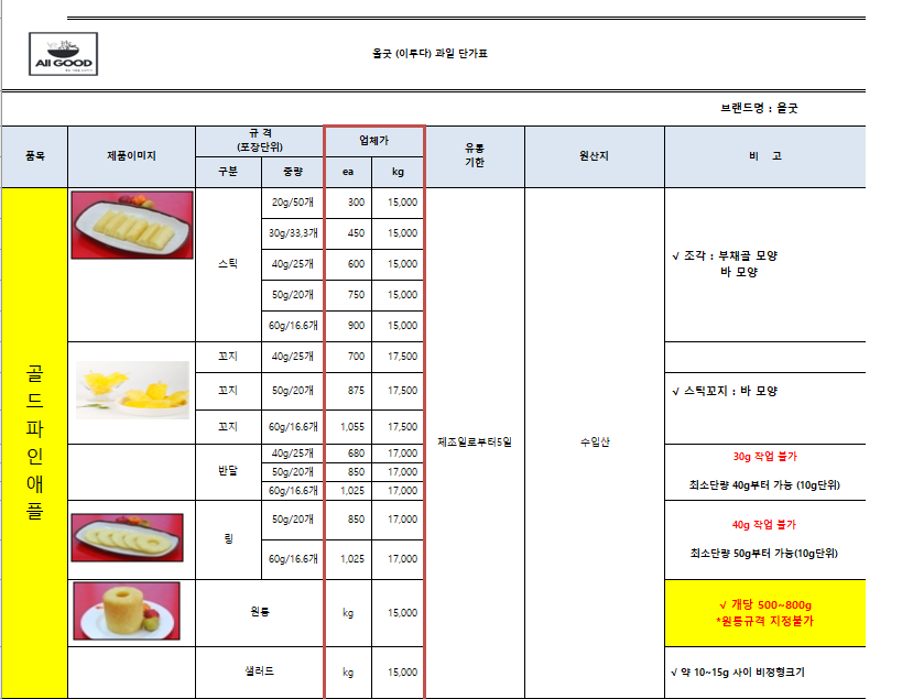 ★★★한맥푸드★★★올굿(이루다)/조각과일,냉동과일/컵과일 04월단가입니다 ★★★★