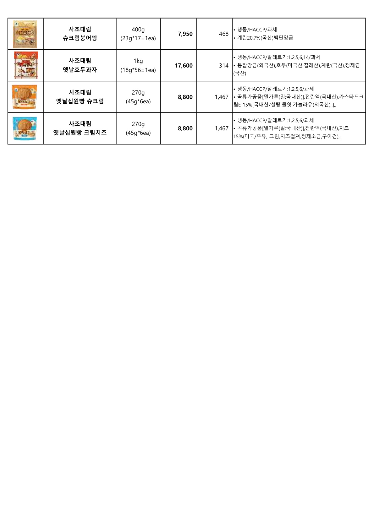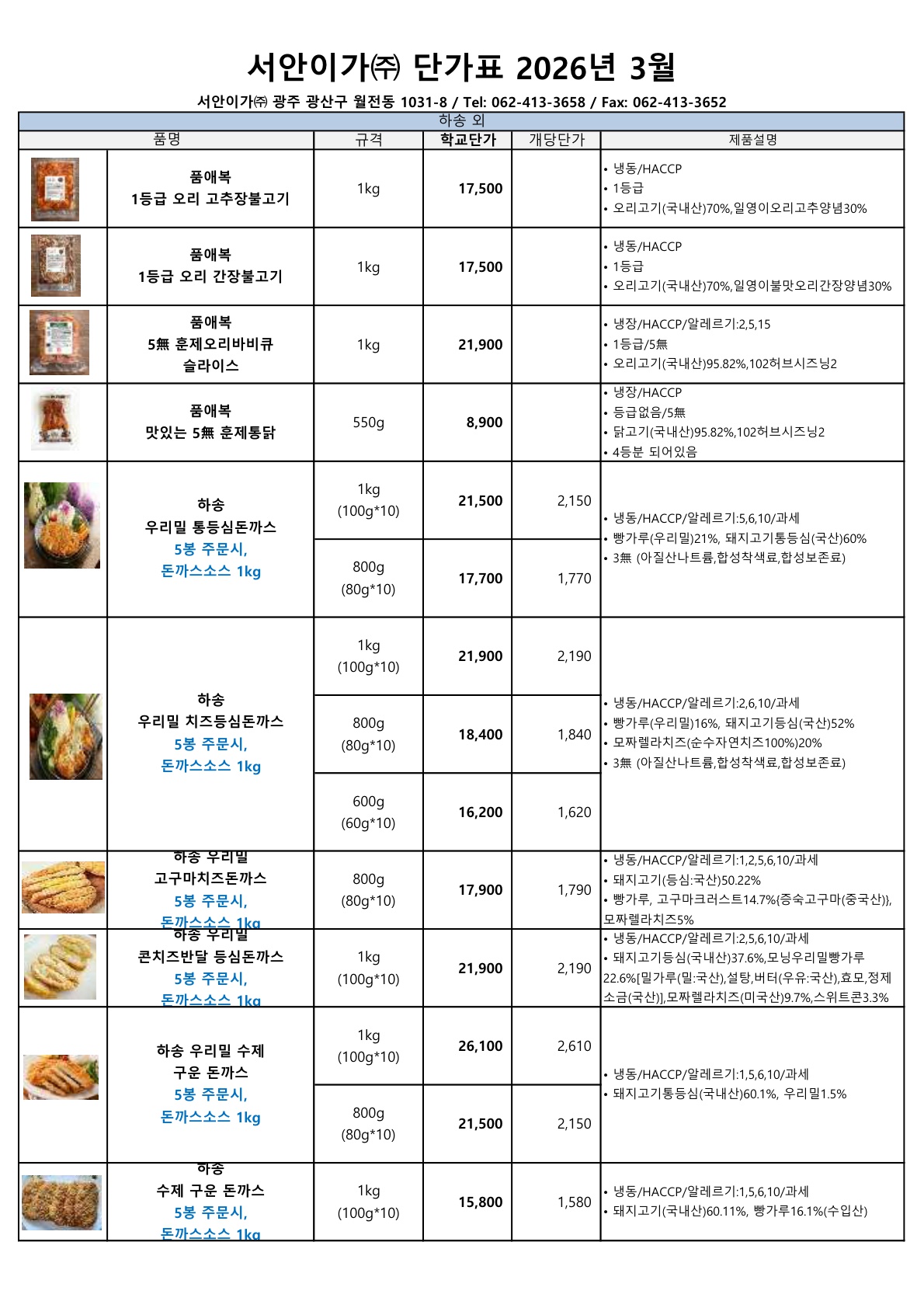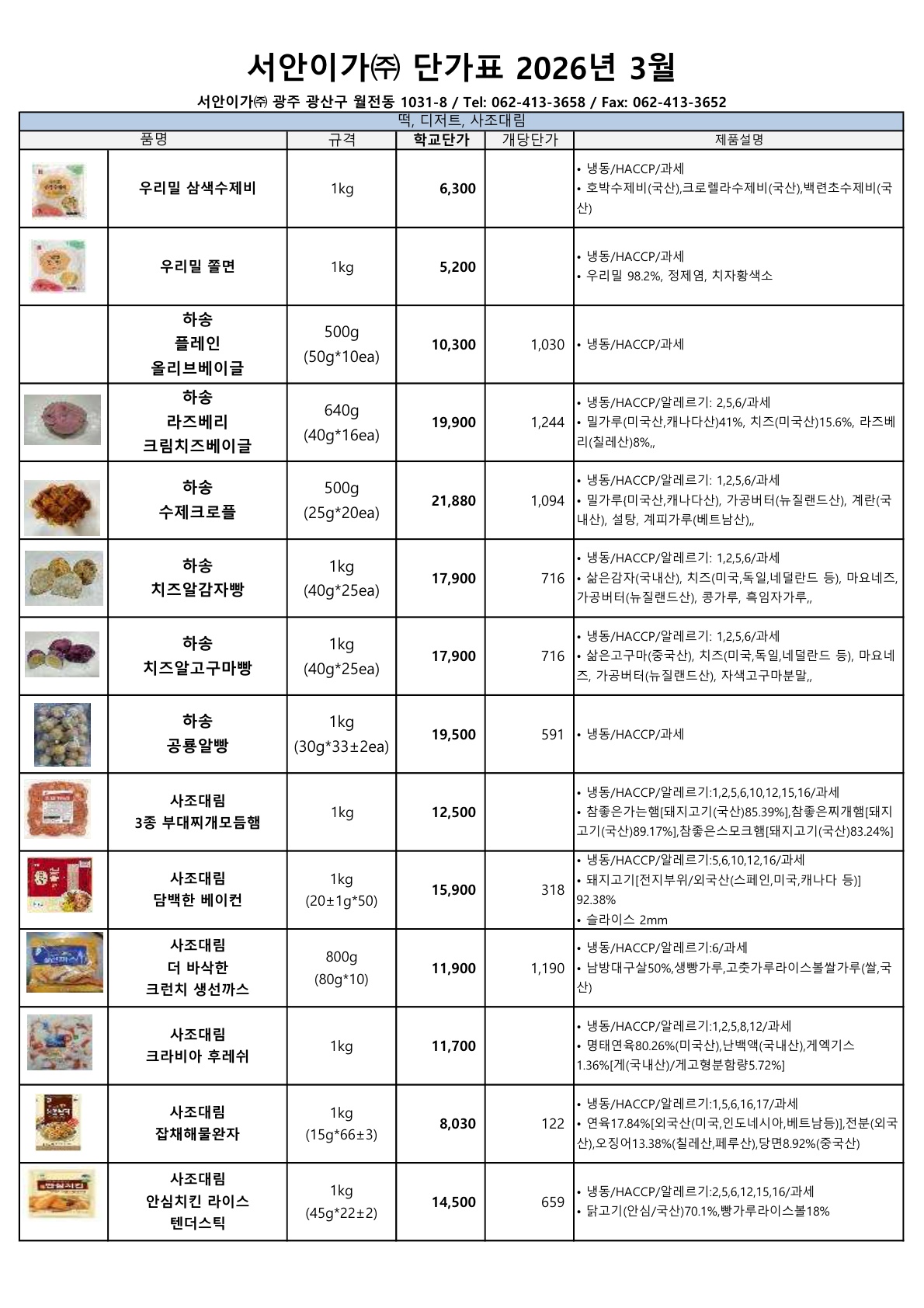 ▶▷ 서안이가 3월 (하송, 사조대림) 단가표