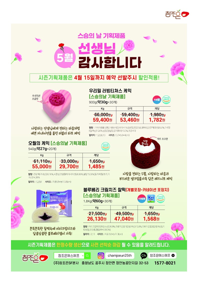 ♠참조은♠[2024년 5월 스승의날 케익(4월15일까지 선발주)- 우리밀 러빙티쳐스케익,오월의케익,블루베리크림치즈찰떡(개별포장-카네이션포장지),수리취우유크림떡]