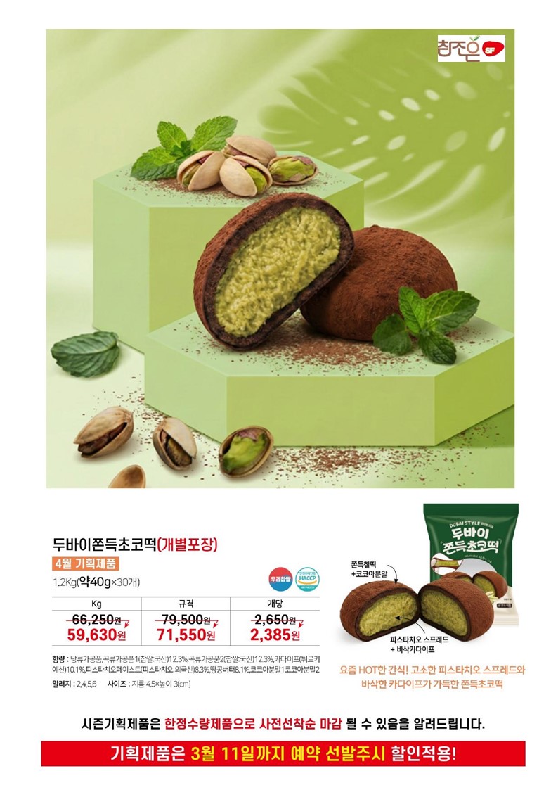 두바이쫀득초코떡은 3월첫주 급식분부터 공급 가능합니다.