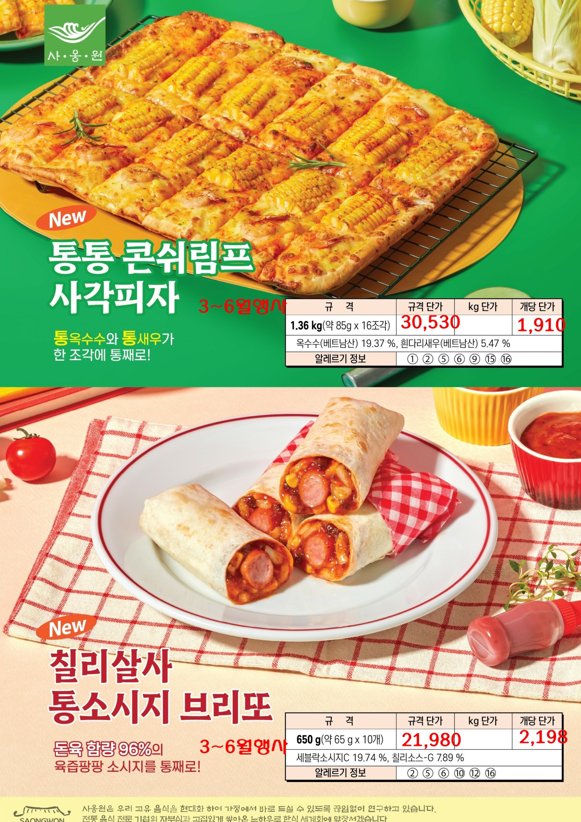 ▶▶▶수연푸드◈사옹원(김말이,통통콘쉬림프사각피자,순살아귀튀김,브리또,사각피자,동태전,깻잎전,육전,고기완자,해물완자,김치전,해물파전,우유튀김등)◈26년4월단가입니다.◀◀◀