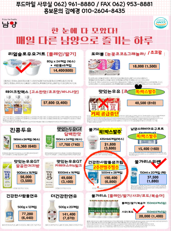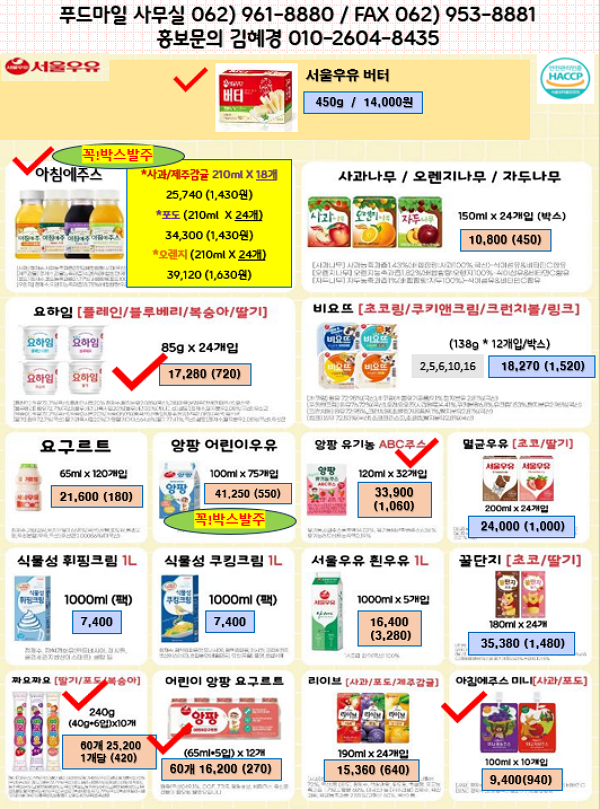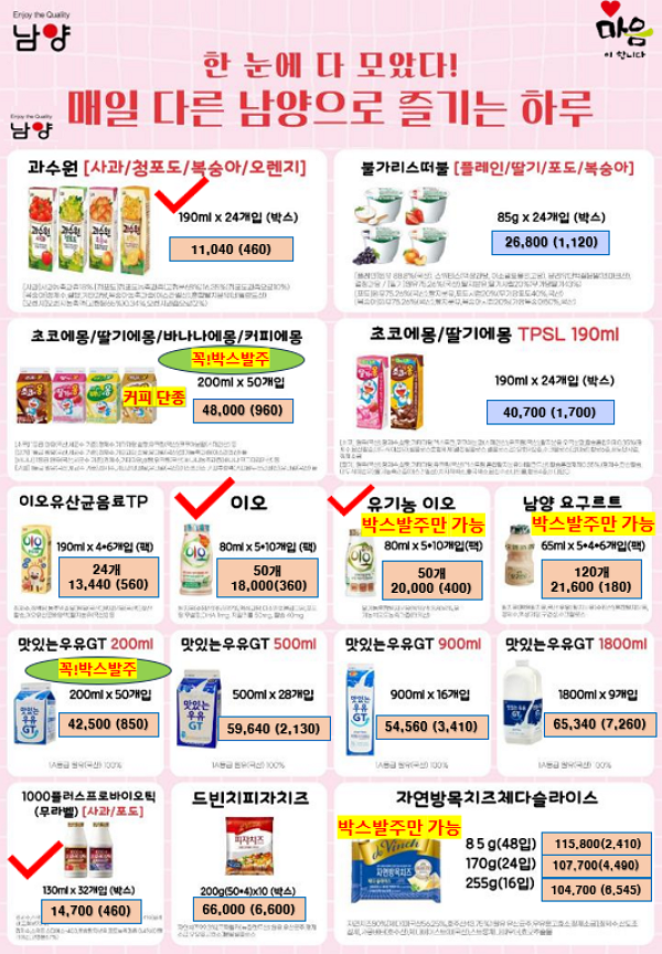 ♥♥♥ 푸드마일 마음 4월 단가표 입니다 ♥♥♥ 서울우유, 망고우유빙수세트, 남양유업, 강동오케익, 앙버터호두과자, 연세우유크림떡, 연세우유크림팝콘, 에그타르트, 마들렌, 딸기삼각케익, 두바이피스타치오초코바, 샌드위치, 창억떡, 수제스모어쿠키, 젤리, 차슈, 동파육, 돼지고기참나무캠핑꼬치구이, 돈마호크, 채접살, 전복솥밥, 홍삼전복, 오리불고기,