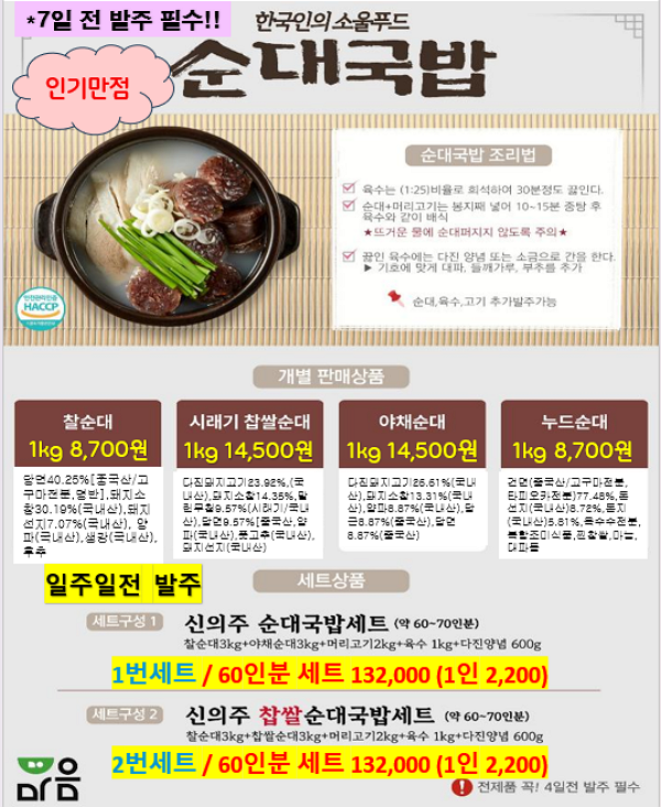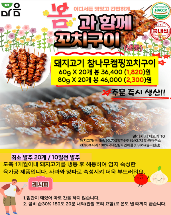 * 돼지고기캠핑꼬치구이, 순대국밥, 샌드위치, 케익, 돈마호크, 전복, 오리슬라이스류는