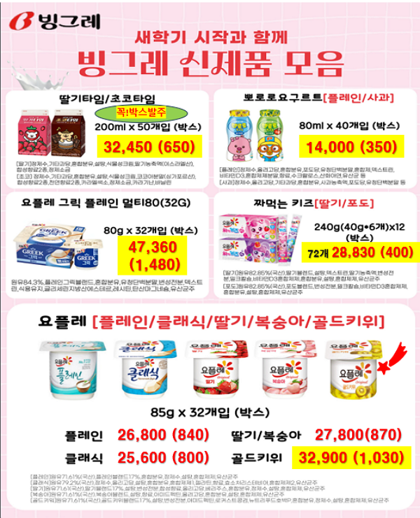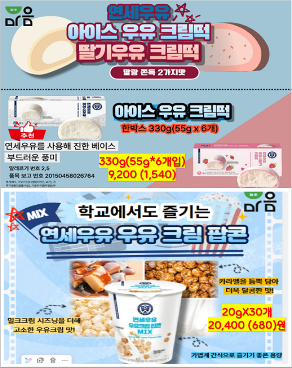 망고우유빙수세트, 서울우유버터, 남양유업, 강동오케익, 앙버터호두과자, 연세우유크림떡, 연세우유크림팝콘, 에그타르트, 마들렌, 딸기삼각케익, 두바이피스타치오초코바, 샌드위치, 창억떡, 수제스모어쿠키, 젤리, 차슈, 동파육, 돼지고기참나무캠핑꼬치구이, 돈마호크, 채접살, 전복솥밥, 홍삼전복, 오리불고기, 마라로제오리불고기, 짜장오리불고기, 훈제오리밀쌈, 수제한우떡갈비, 초코에몽쭈쭈바아이스크림, 순대국밥, 족발슬라이스, 진짜사과당근주스, 비요뜨, 초코에몽, 빙그레,,,