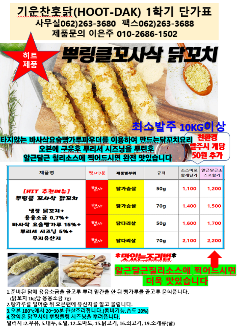 기운찬훗닭5월단가표 뿌링클꼬사삭닭꼬치,오렌지뾰요아사도(스페인요리),오향닭보쌈,맵코바치킨,맵지마라닭꼬치,매콤요야꼬동,찜닭,치밥,…