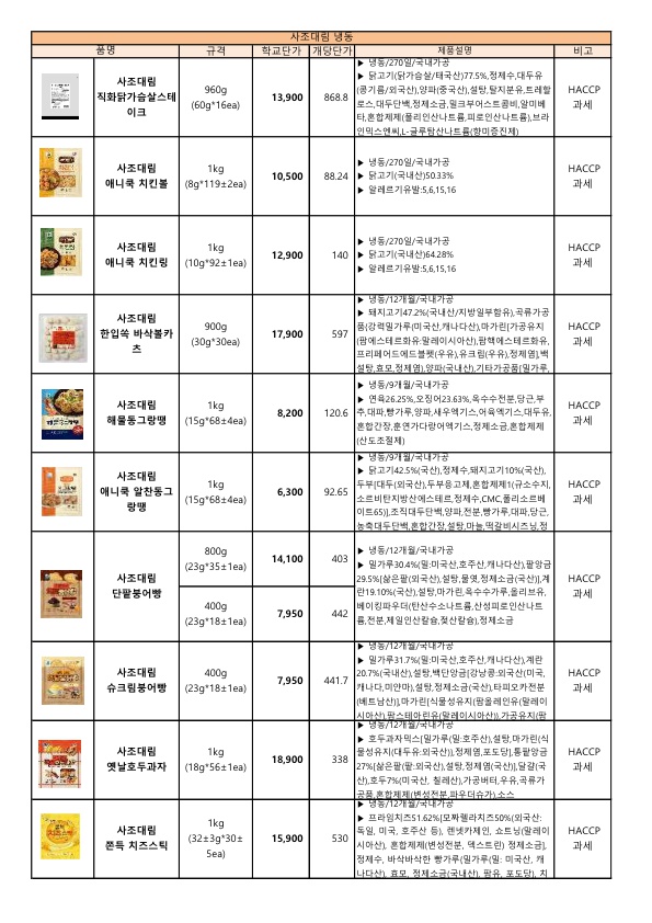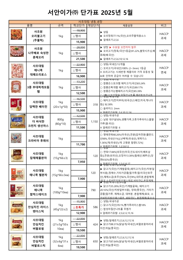 ▶▷하송(서안이가) 5월【사조원 오리불고기,훈제오리】【사조대림 냉장,냉동】(생선까스,만두,전병,텐더,부대햄,베이컨,크라비아,…