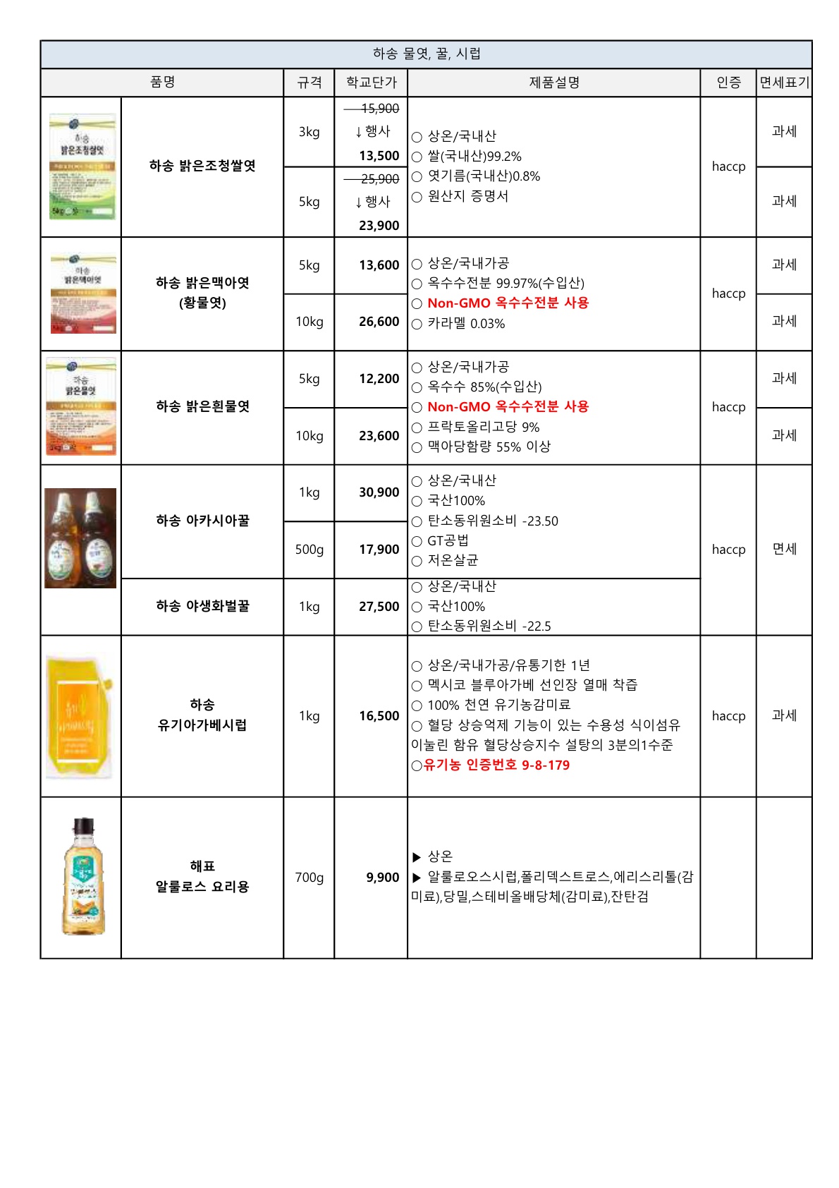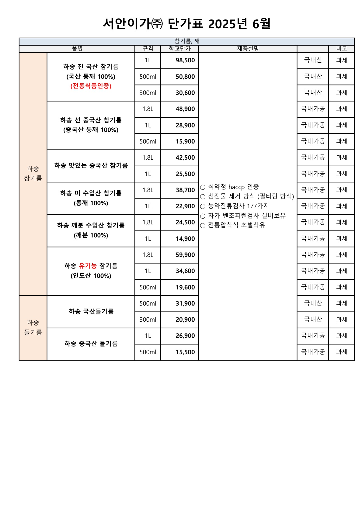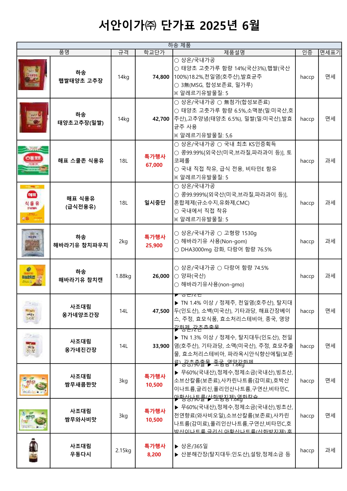 서안이가(하송) 전체 단가표 입니다
