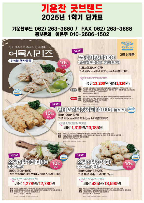 기운찬 굿브랜드 1학기 단가표 (피자,호롱낚지,오징어링,묵찌빵,남도꼬막비빔밥세트,마라아귀찜세트,메콤팝콘오징어볼 )