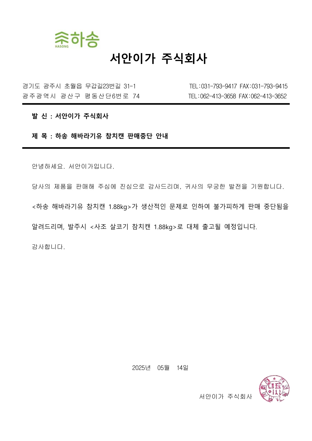 ▶▷ 서안이가(하송) 하송해바라기유참치캔 판매중단, 대체출고 안내