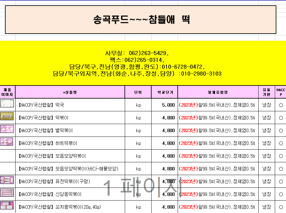§§송곡푸드§§ 참들애떡 7월 단가표입니다 §§§§