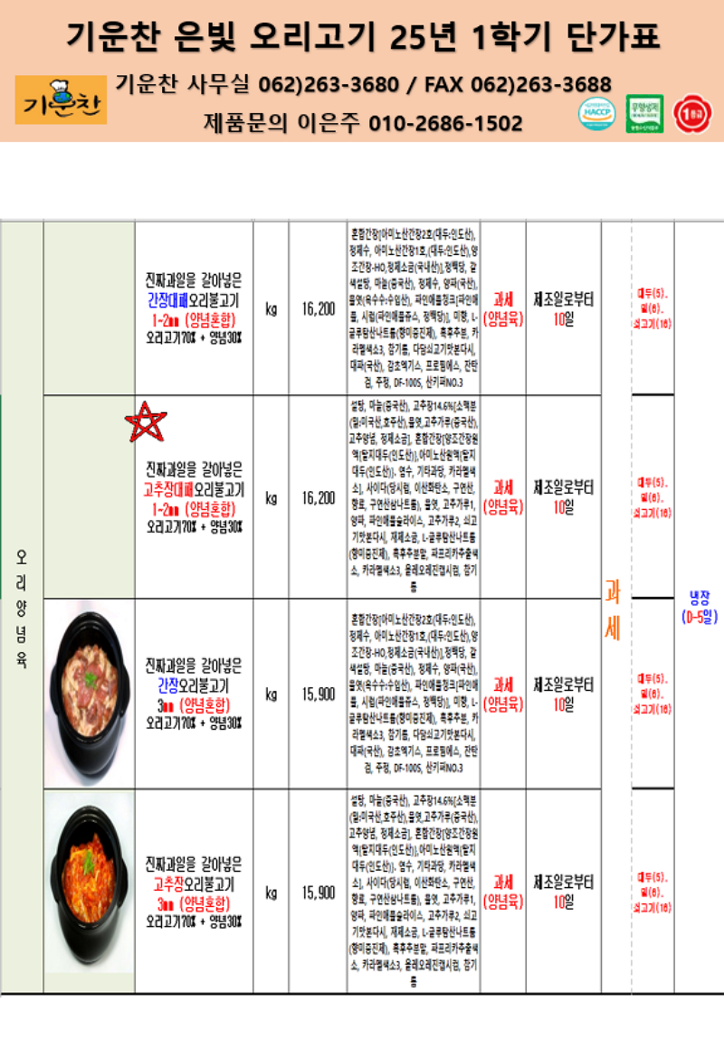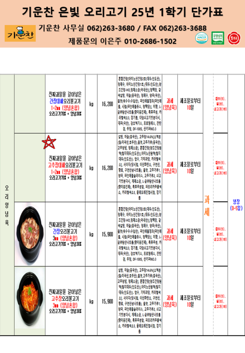 기운찬 은빛오리 2025년 1학기 단가표입니다. ♣ 급냉대패오리슬라이스, 간장오리불고기생오리슬라이스, 9무블루베리오리훈제쵸핑,오리훈제슬라이스, 통오리백숙용♣