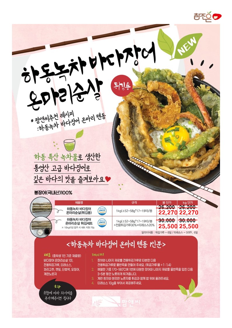 참조은~♠팜앤씨♠[2025년 7월 단가표](하동녹차바다장어,싱싱참대구코다리알탕세트,달고기프라이드피쉬,명태까스,광어까스,바다장어튀김,아귀튀김,깐풍꼬다리,초당옥수수완자전, 쭈구미탕탕이전,연어스테이크,통살새우꼬지,감자말이새우,치즈볼,대하새우살,버터플라이적새우,블랙타이거새우, 광어살강정세트,해물탕,소라쭈구미채,오징어링튀김등)
