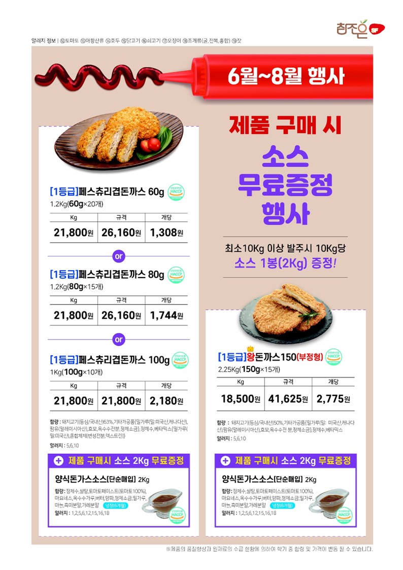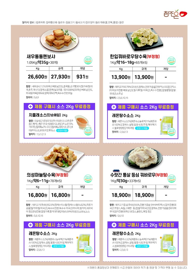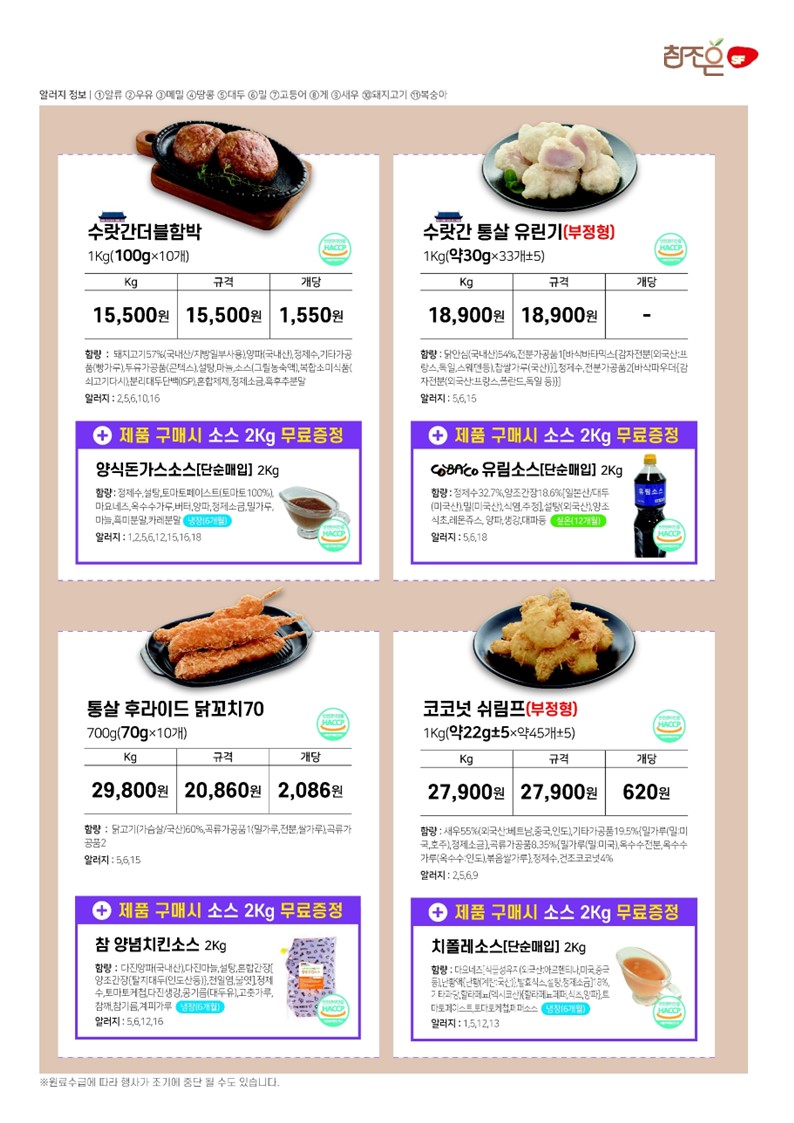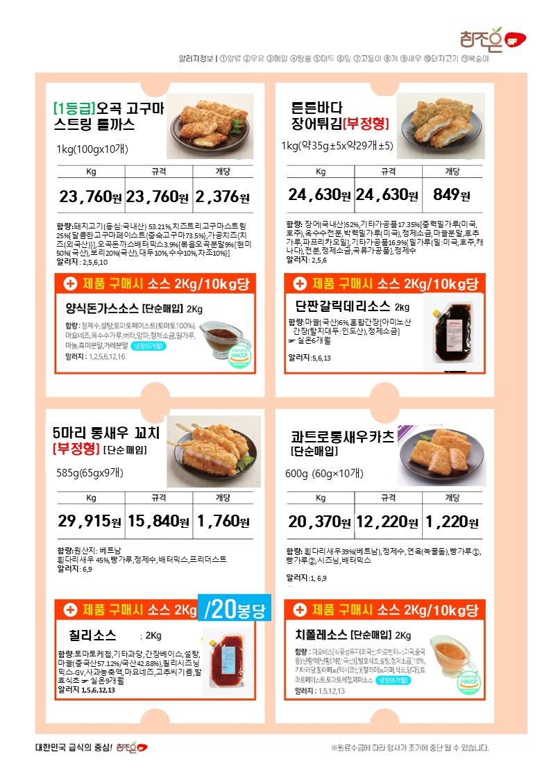 ♠참조은♠[2025년7월 소스와 함께] - 우리쌀크런치명태까스,남도왕떡갈비,참새우탕수,페스츄리겹돈까스,왕돈까스150,수랏간유린기,통살후라이드닭꼬치70,한입꿔바로우탕수육,코코넛쉬림프,의성마늘탕수육,수랏간통살등심꿔바로우, 수랏간더블함박,체다치즈더블함박,피자치즈더블함박,마음이가오곡치즈롤까스,수랏간순살가자미까스,오곡고구마스트링롤까스,튼튼바다장어튀김,순살크런치생선까