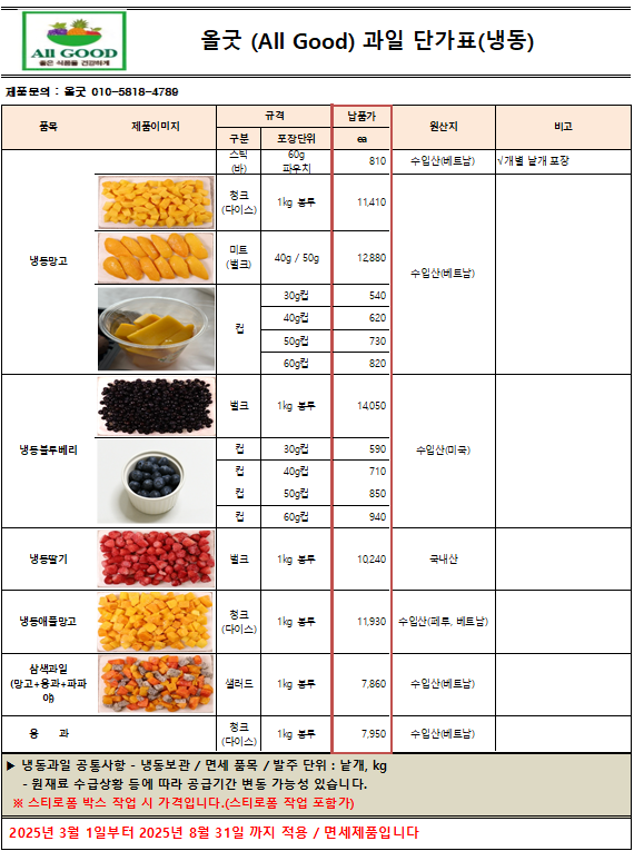 ◈◈한맥푸드◈◈ 올굿(이루다)/조각과일,냉동과일/컵과일 7월 단가표 ◈◈◈◈