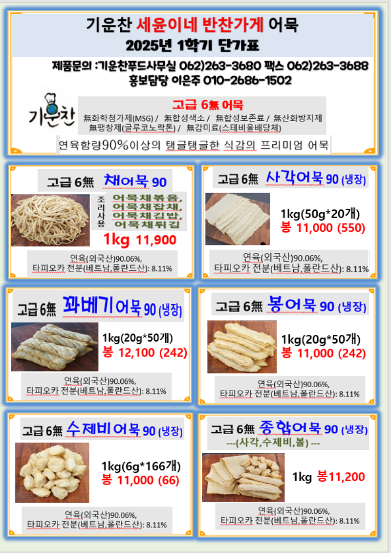 고급채어묵, 고급6무 사각어묵, 꽈배기어묵, 봉어묵, 수제비어묵,종합어묵, 사각꼬지어묵, 길쭉잡채말이어묵, 사각어묵, ,,,