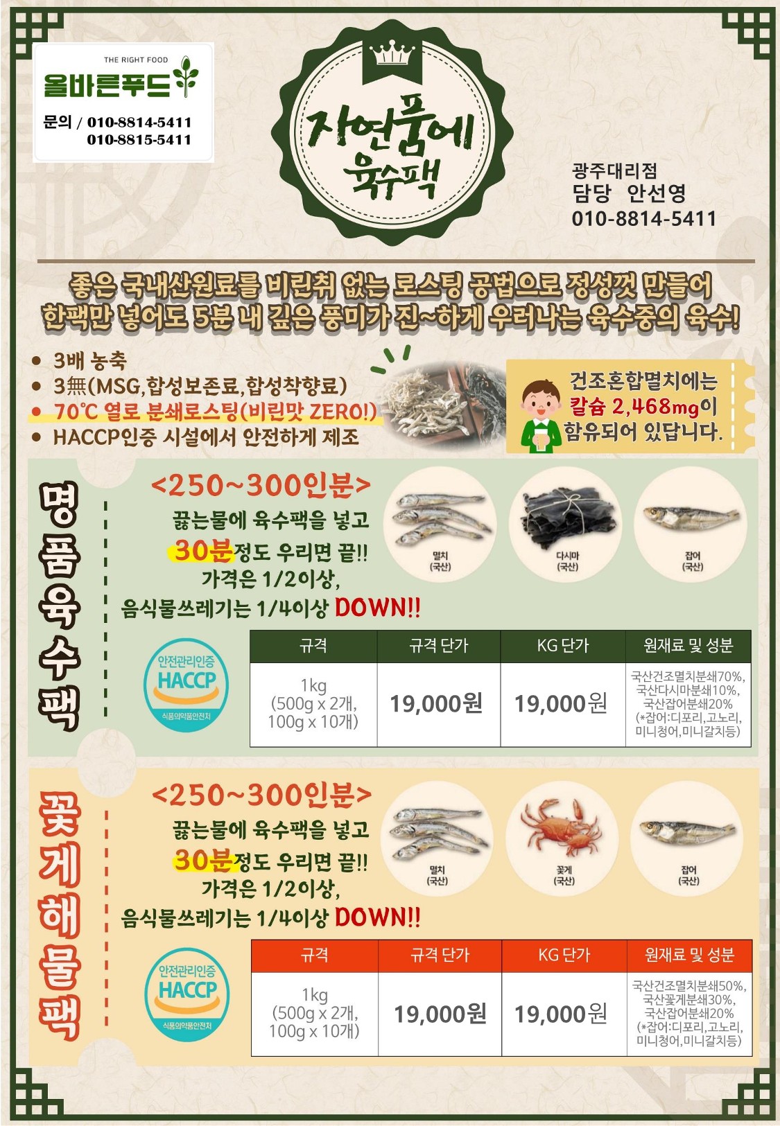 《올바른푸드》♣♣자연품에- 25년 4월 명품육수팩, 꽃게해물팩 단가표(1kg-500g*2ea/100g*10ea)♣♣