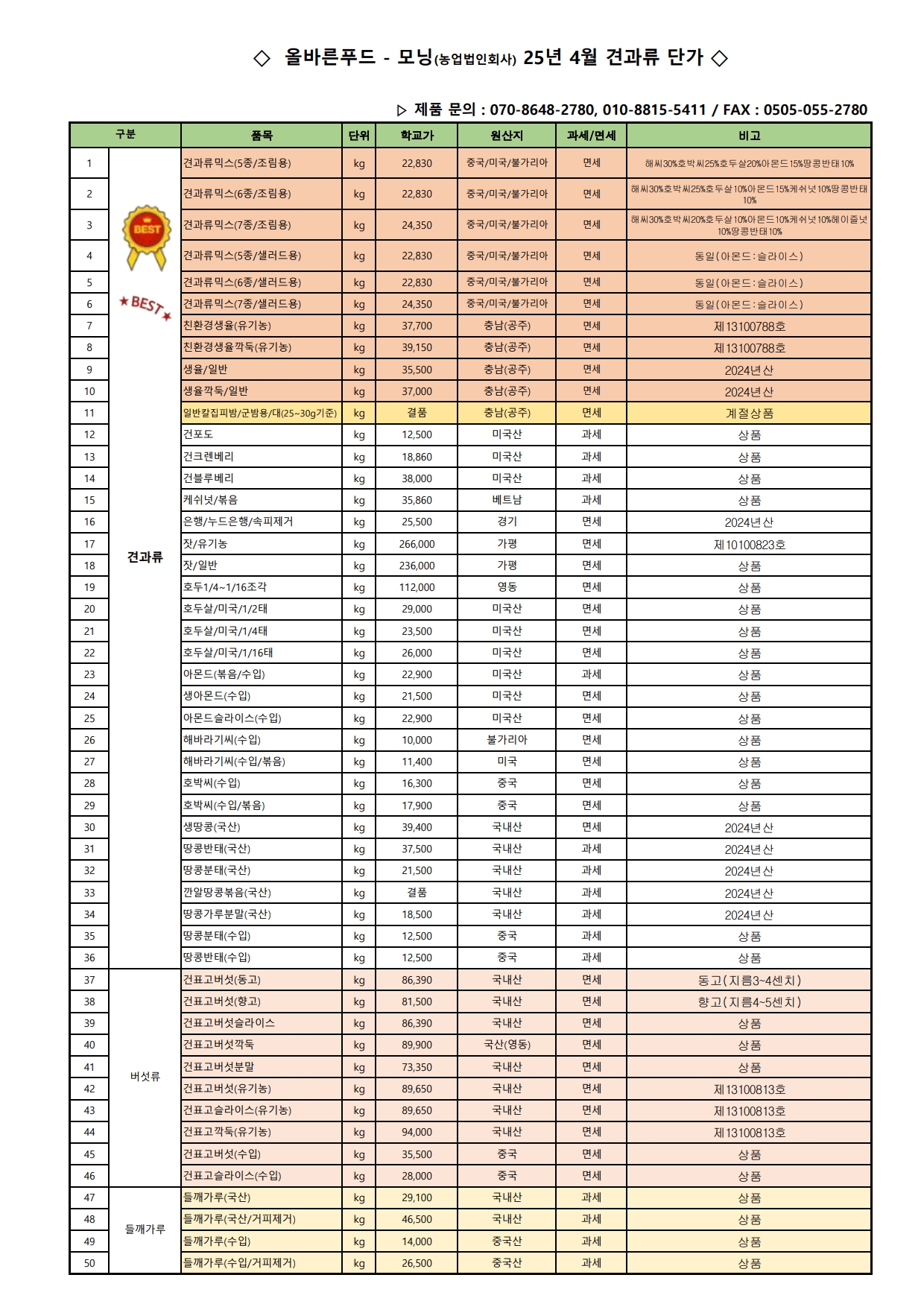- 올바른푸드- 모닝 견과류 25년 4월 단가표.xlsx [size : 30.6 KB] [다운로드 : 1]