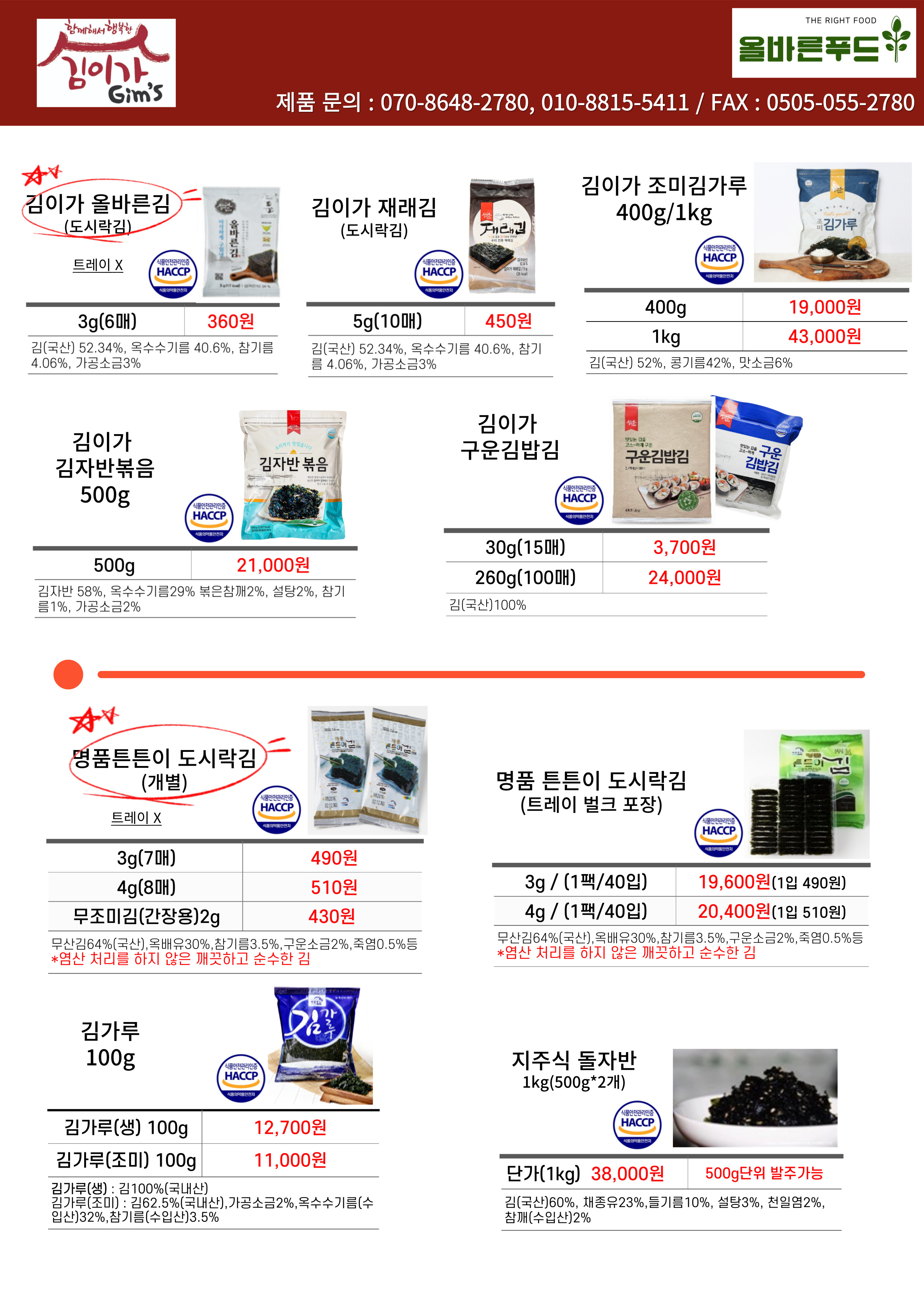 《올바른푸드》♣♣ 김이가, 명품튼튼이김-25년 4월 단가표♣♣ (김이가 올바른김, 김이가 재래김, 명품튼튼이김,…