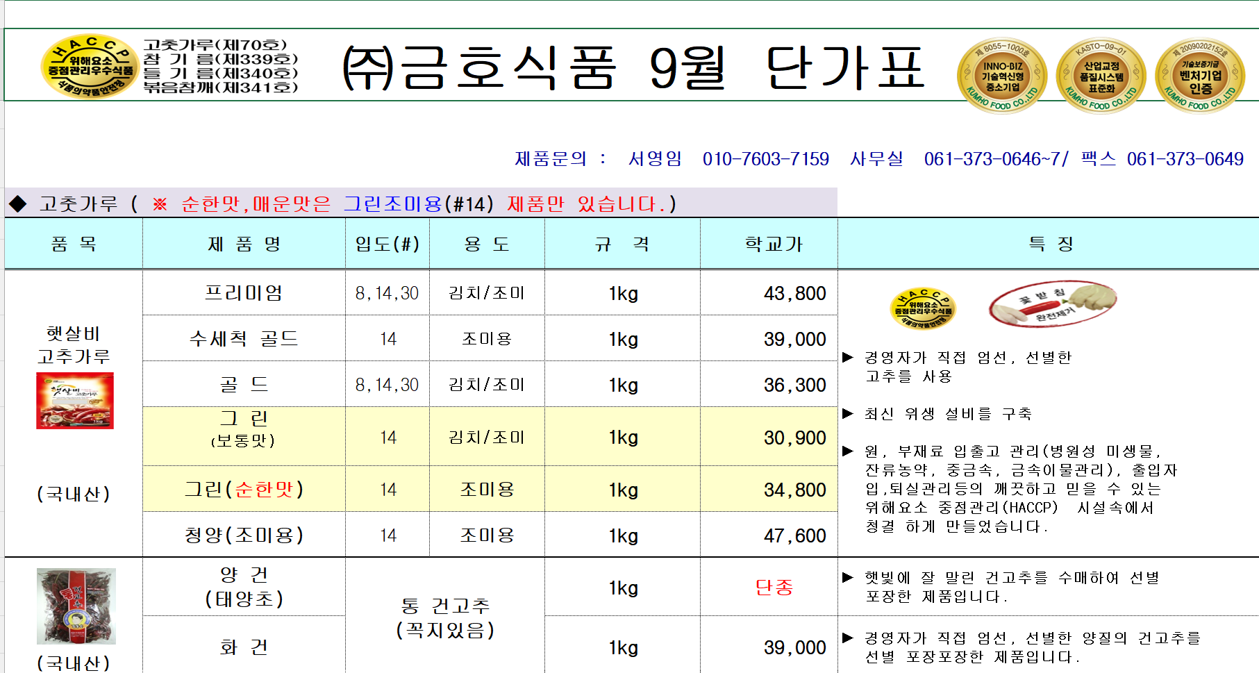 *SFC푸드맘 정닭(정직하고 바른닭) 9월 단가표입니다*
