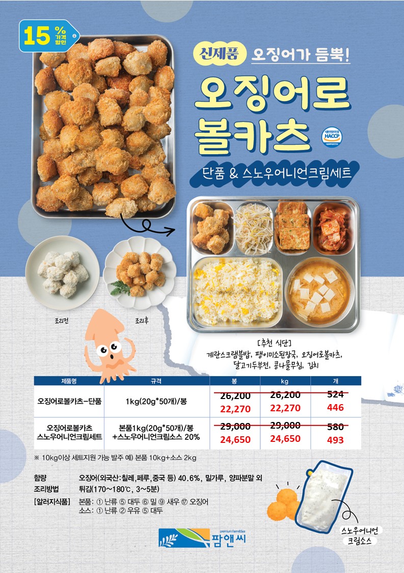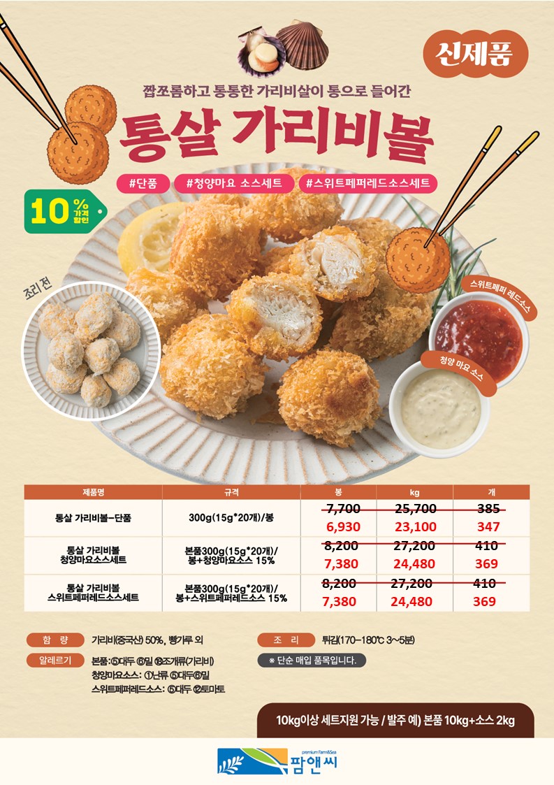 참조은~♠팜앤씨♠[2025년 10월 단가표](피자토핑연어함박,명태까스,광어까스,아귀튀김,깐풍꼬다리,초당옥수수완자전, 쭈구미탕탕이전,연어스테이크,한치깔라마리,감자말이새우,치즈볼,대하새우살,버터플라이적새우,블랙타이거새우, 광어살강정세트,어부의선택해물탕,소라쭈구미채,코다리알탕,생선스테이크,오징어링튀김등)