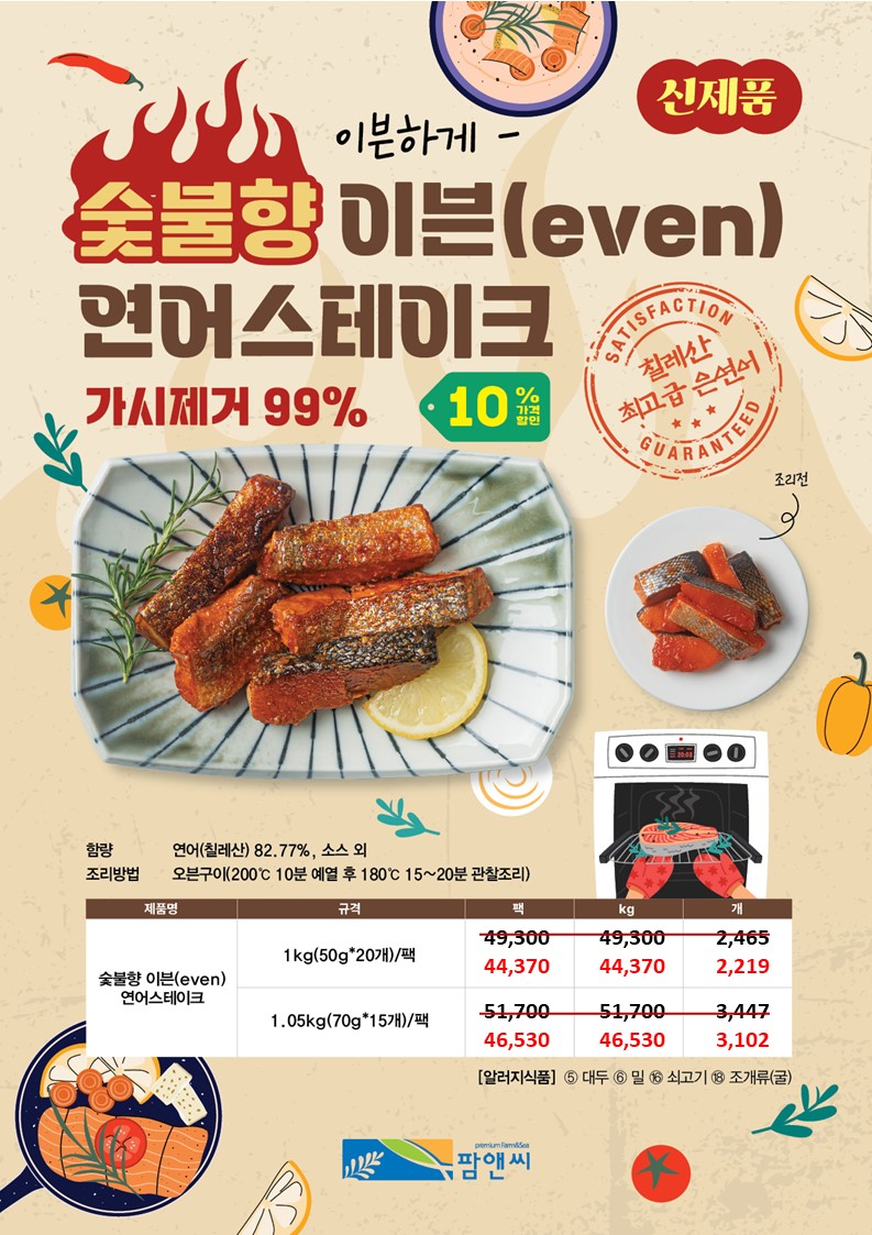 ◆ 할인제품 : 피자토핑연어함박,쭈꾸미탕탕이전,초당옥수수완자전,한치깔라마리,국내산대하새우살,어부의선택해물탕세트,달콤마늘데리아끼연어스테이크,맵달소라쭈꾸미채,