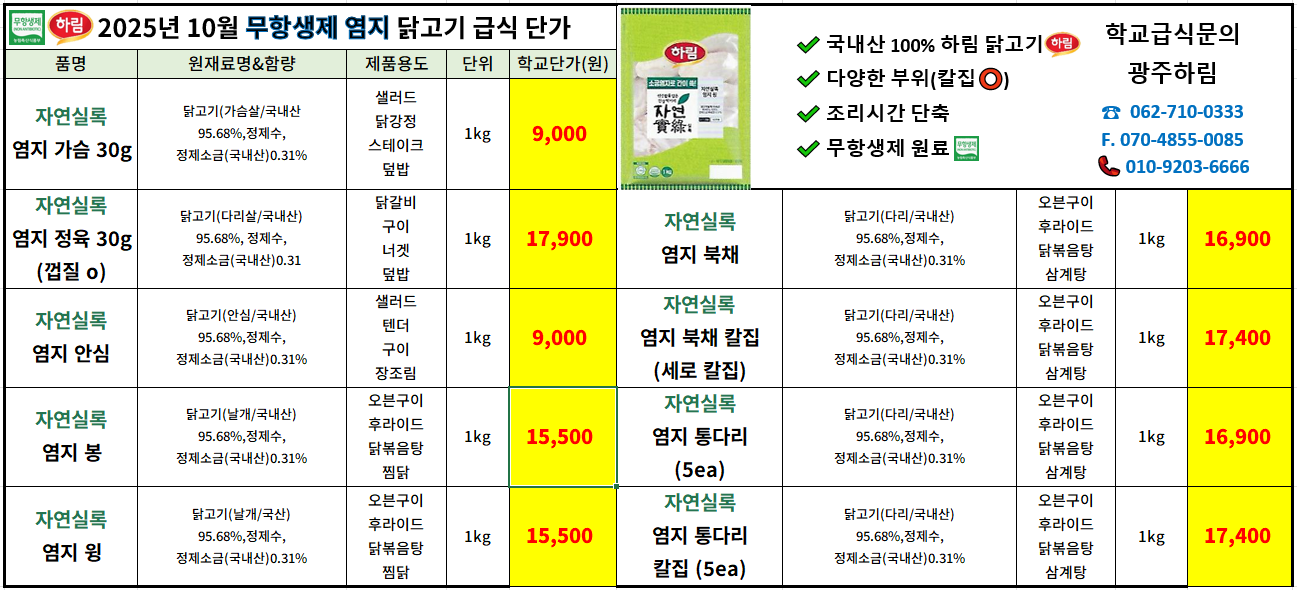 하림 학교급식 10월 동물복지 닭고기/염지닭(무항)/주원산오리/계란(무항)/깐메추리알(무항) 기초가