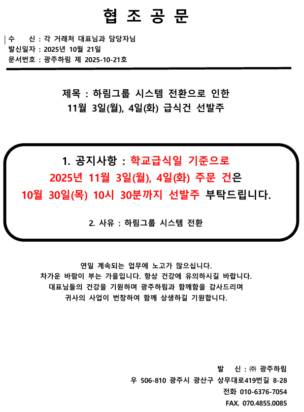 *긴급공지* 광주하림 11월 발주건/필독 부탁드립니다